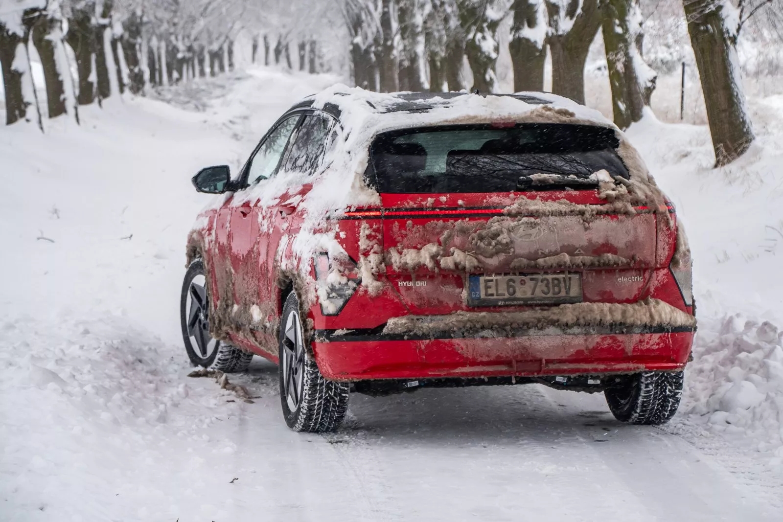 V sobotu za neustálého sněžení jsme se rozhodli pro zajímavost zajet tu stejnou trasu znovu. Podmínky se ale změnily. Teplota byla -4 °C, zejména na první třetině trasy byla silnice kompletně pokrytá sněhem a na dálnicích byly vyjeté koleje mezi rozježděnou břečkou. A pořád sněžilo, což znamenalo nutnost zapnout nejen stěrače, ale také časté zapínání ofuku oken, protože ta se docela hodně mlžila. Kona EV není první elektromobil, u kterého jsme se s tím setkali. Ve finále jsme celou trasu ujeli za dvě hodiny a 16 minut, rychleji to nešlo. Na dálnici jsme jeli maximálně 120 km/h, celkově ale bylo tempo pochopitelně pomalejší. Výsledná spotřeba byla 24,8 kWh/100 km. Téměř dvojnásobek oficiálního čísla.