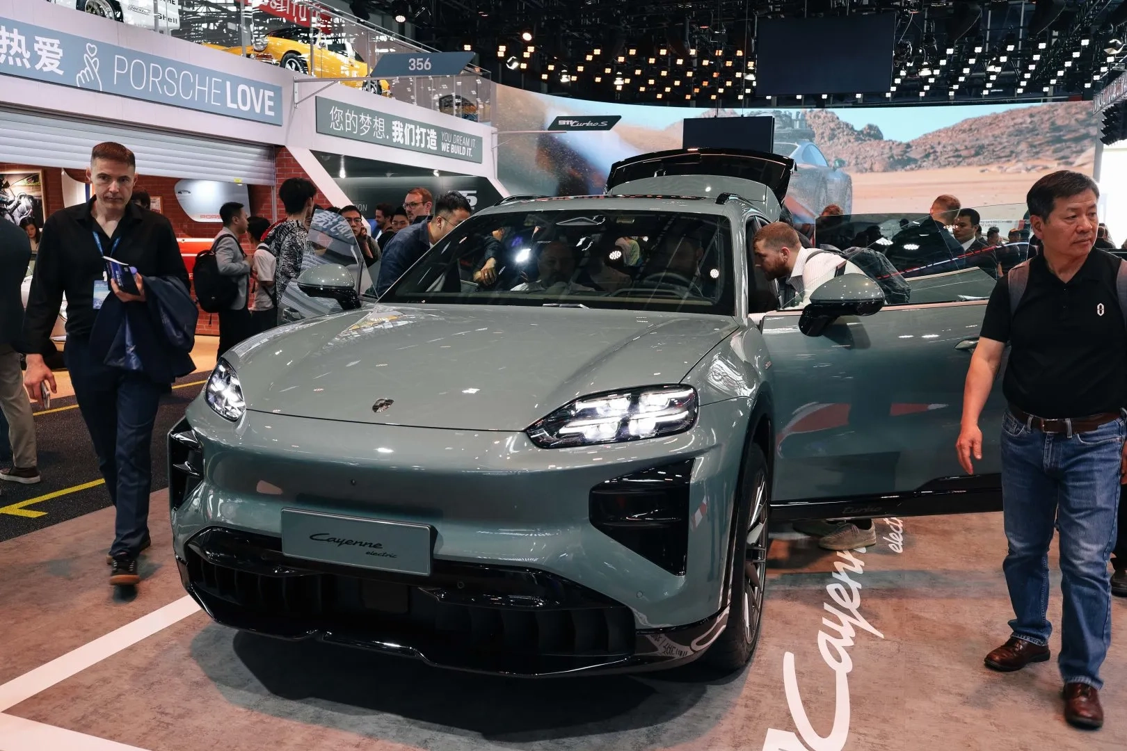 Porsche se snaží ukázat zejména nový elektrický Cayenne, který právě v Pekingu představilo i ve verzi Coupé. Podle zástupců značky má odkazovat tvar zadní části na legendární Porsche 911, oproti které však měří bezmála pět metrů. Nabízí však výrazně více prostoru.